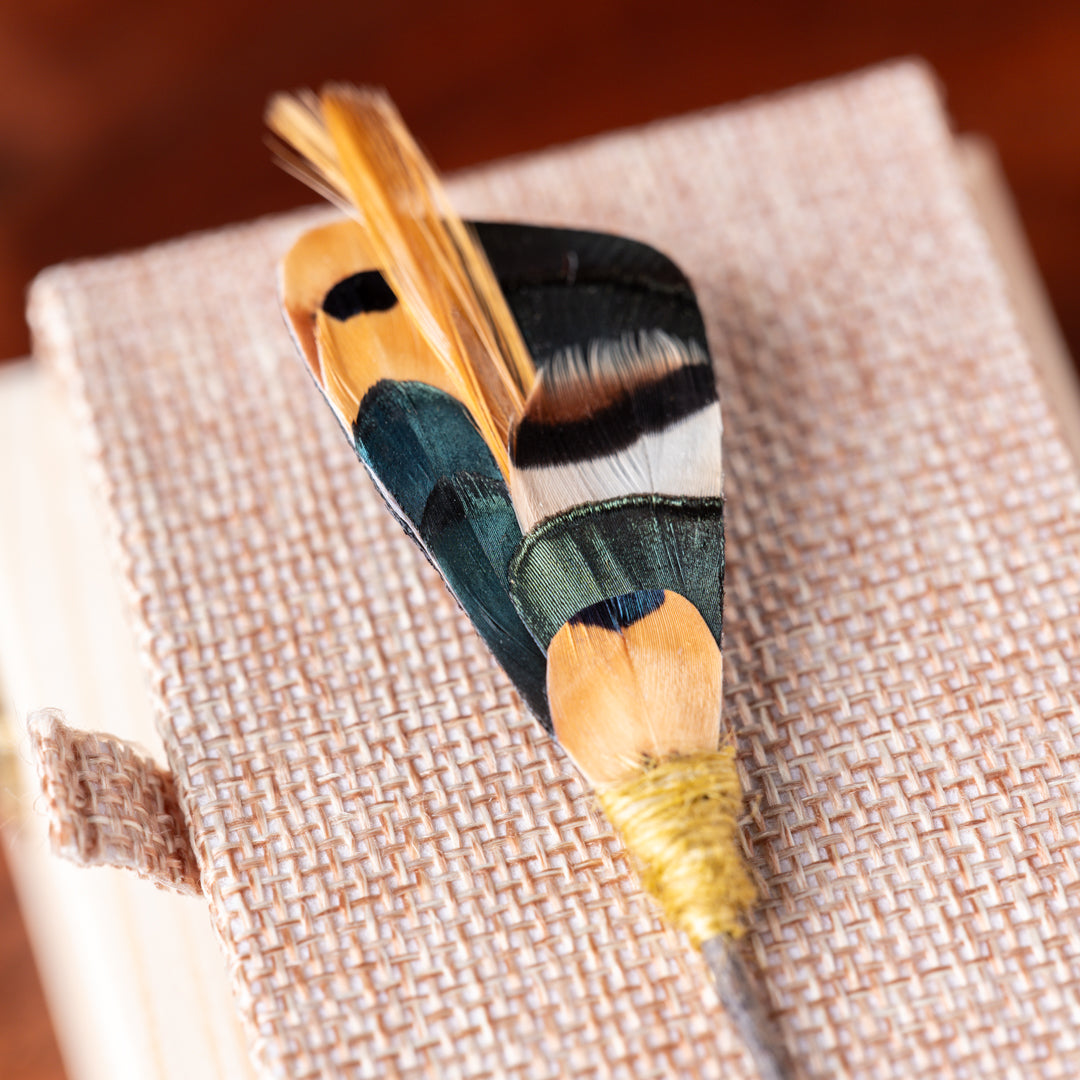 Feathers- Sustainably sourced layers of grey partridge, army green and navy blue pheasant, and golden tan rooster feathers.