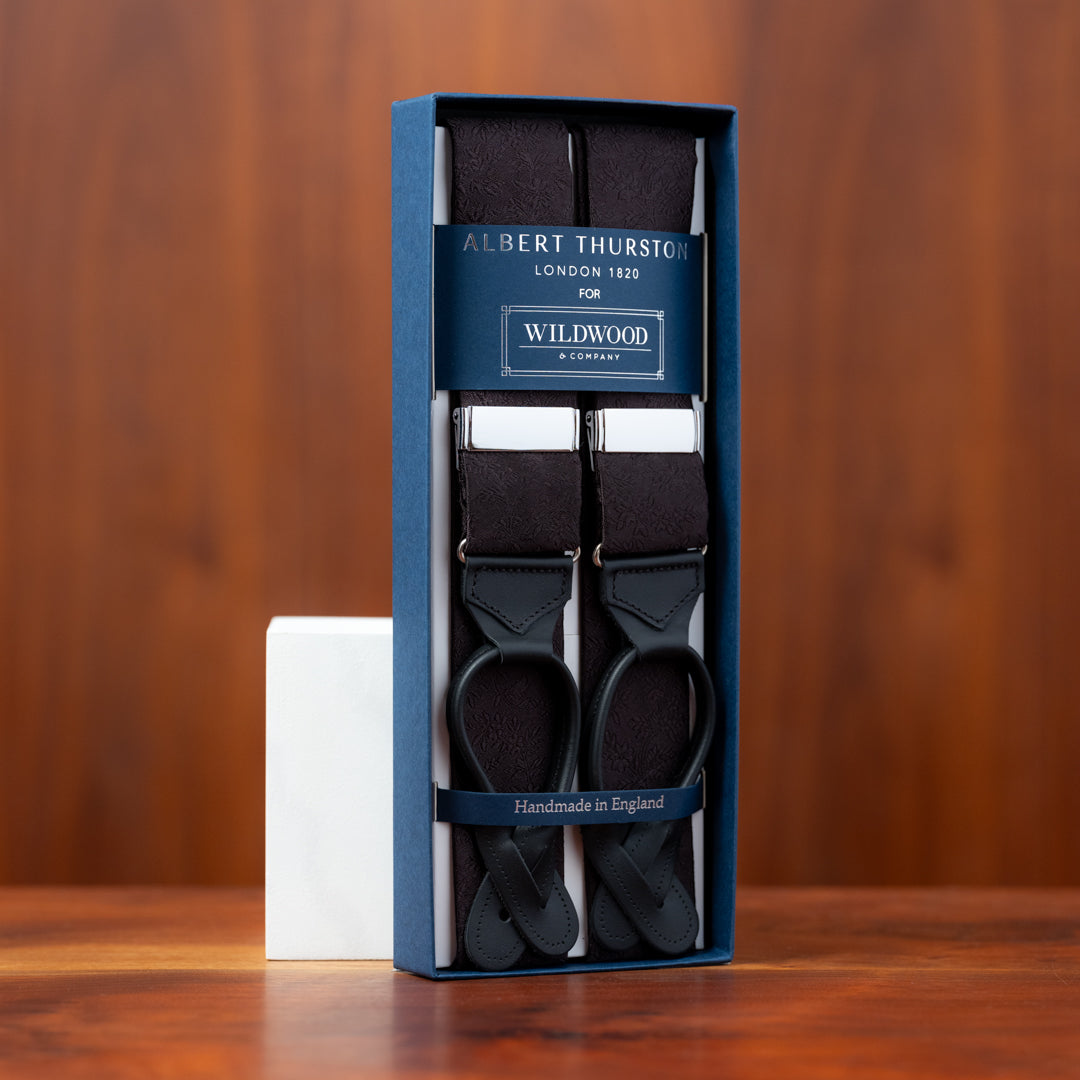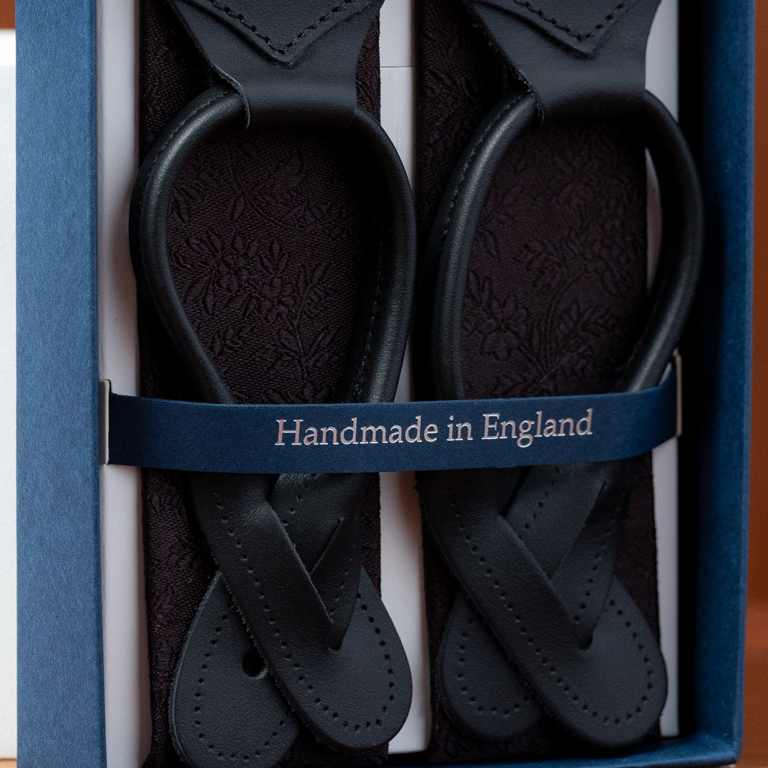 These suspenders (also known as braces in the UK) are handmade in our own unique silk, in collaboration with Albert Thurston, the world's top maker of suspenders since 1820 (who has also made braces for every James Bond film).