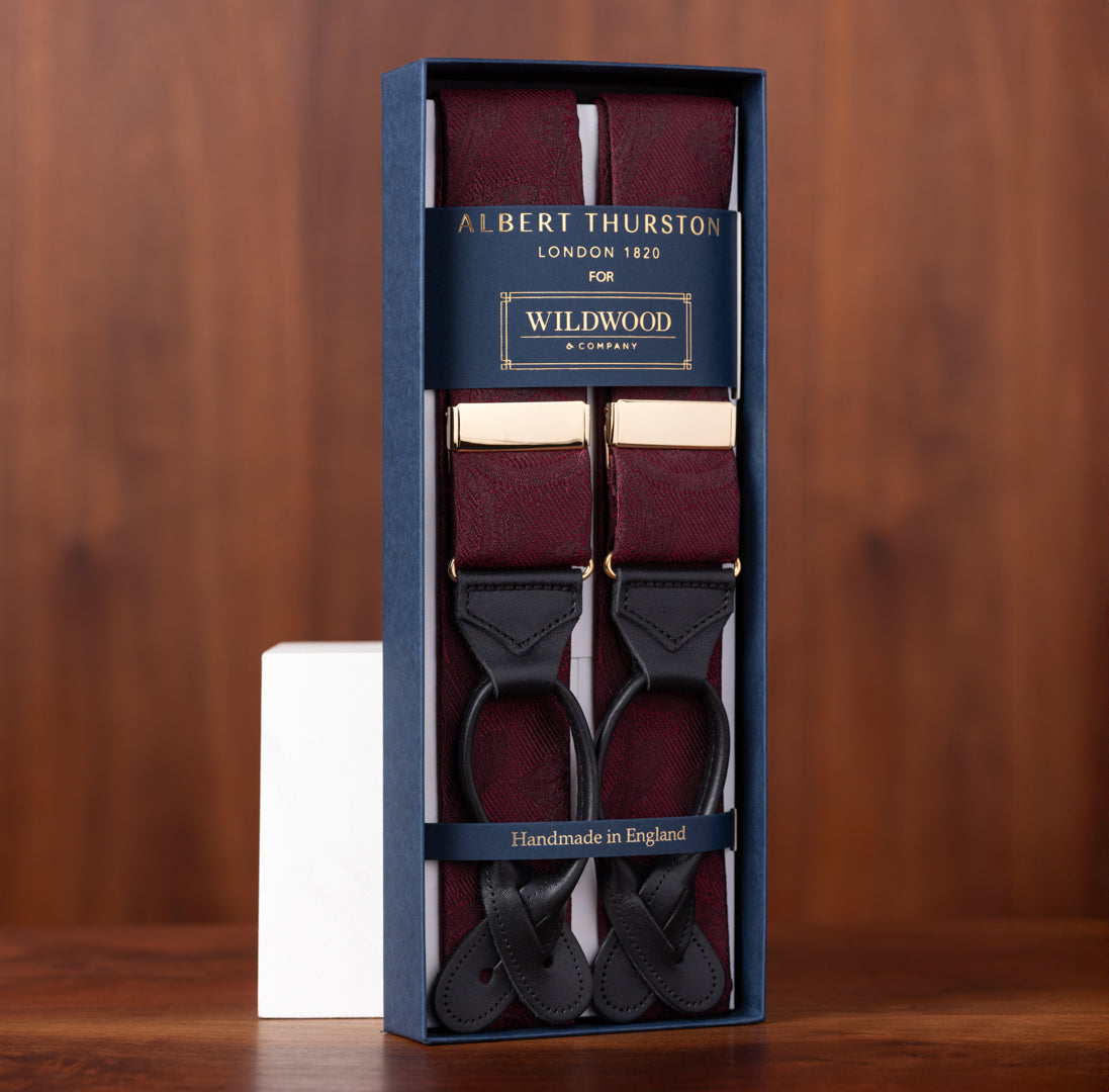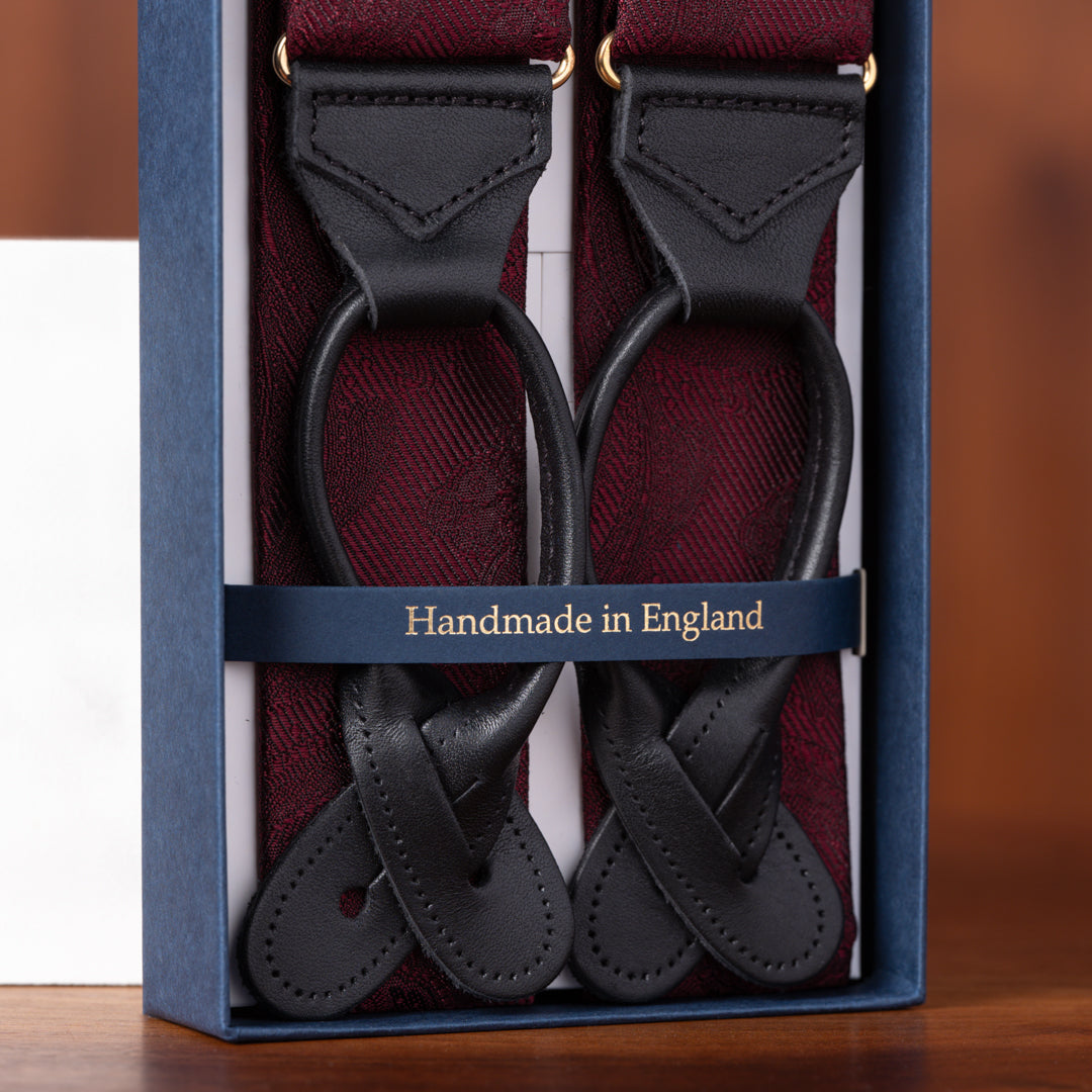 These suspenders (also known as braces in the UK) are handmade in our own unique silk, in collaboration with Albert Thurston, the world's top maker of suspenders since 1820 (who has also made braces for every James Bond film).