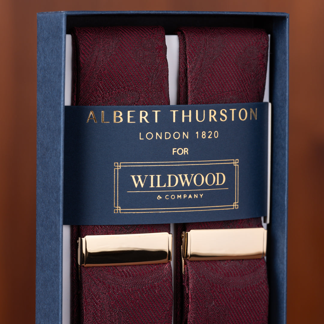 -Silk: Burgundy tonal house paisley; woven in England, in a small batch, exclusively for Wildwood & Company.