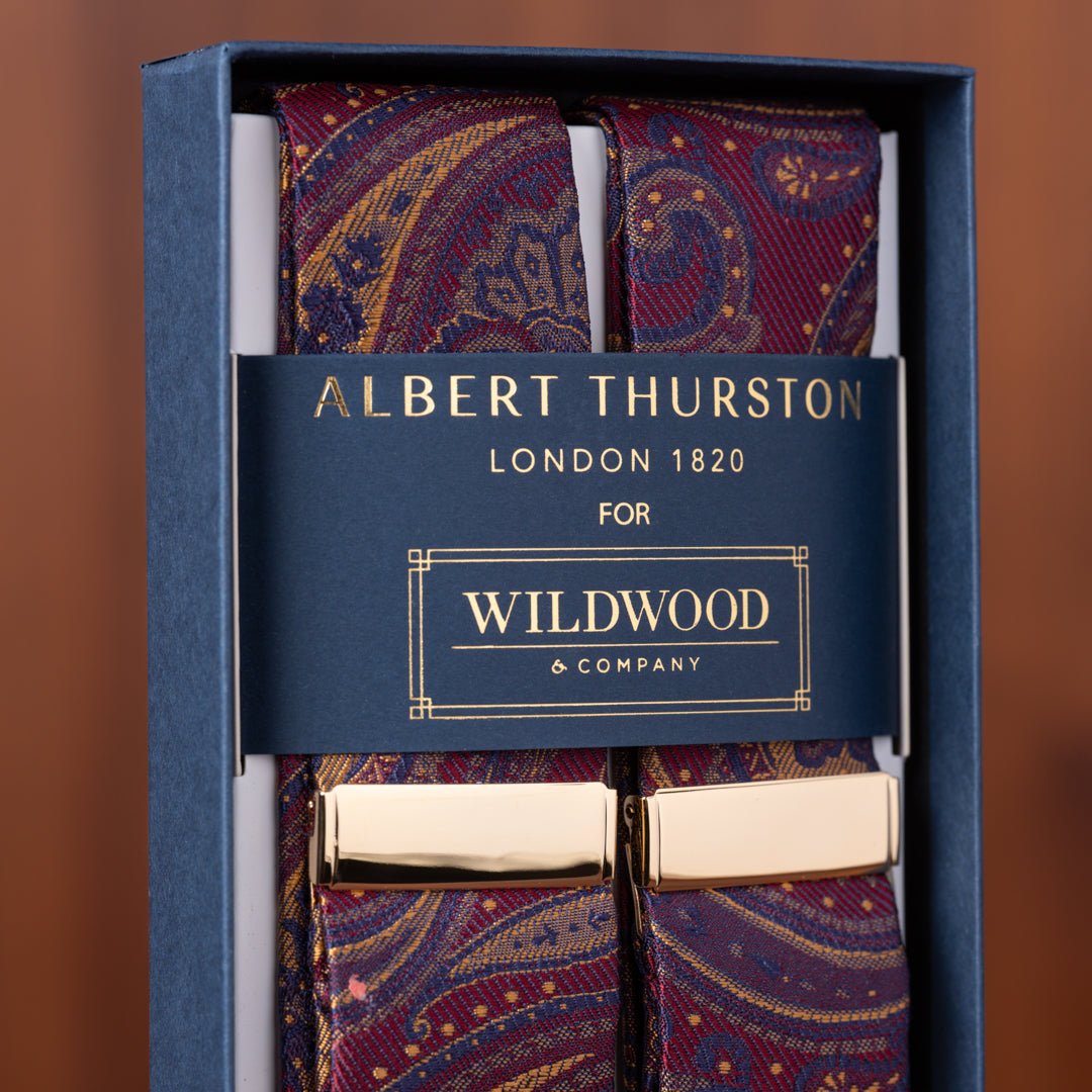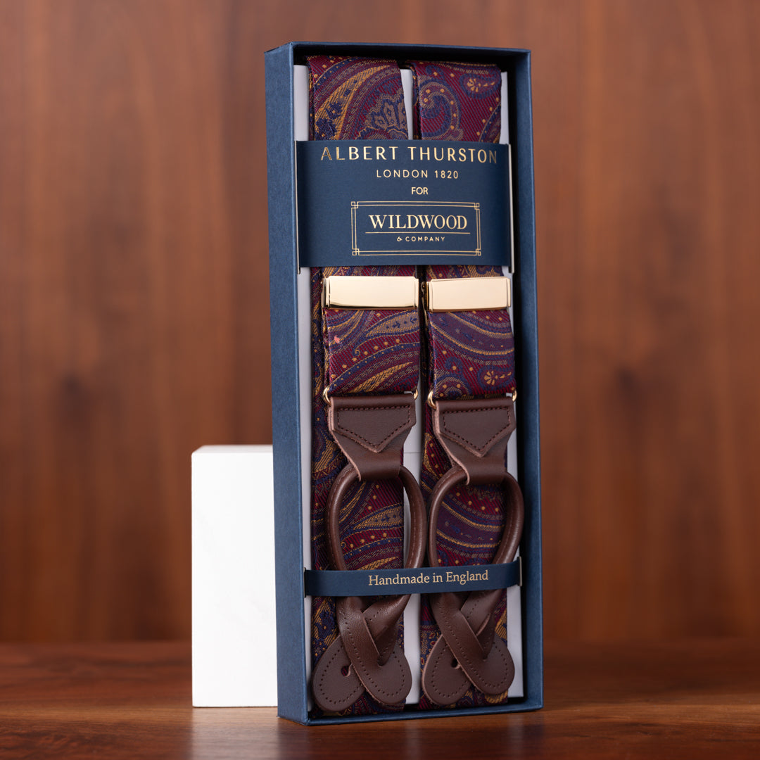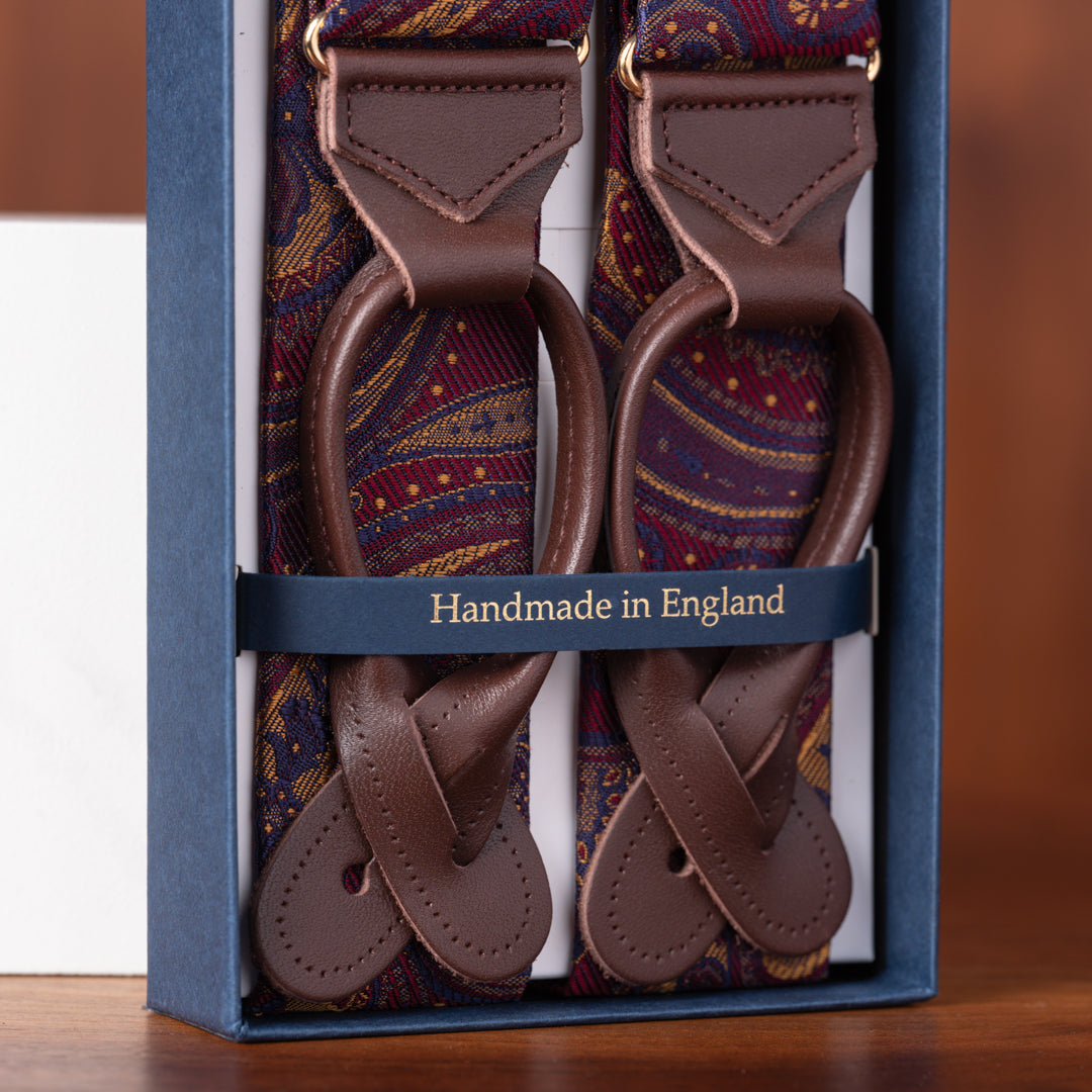 These suspenders (also known as braces in the UK) are handmade in our own unique silk, in collaboration with Albert Thurston, the world's top maker of suspenders since 1820 (who has also made braces for every James Bond film).