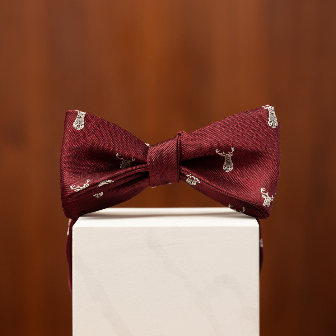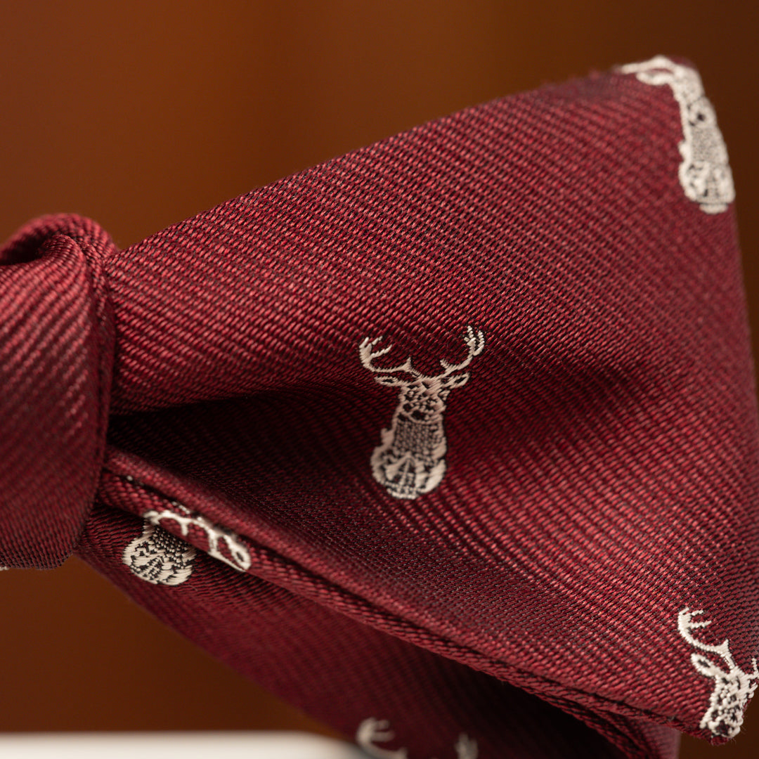 -Silk: Burgundy with Wildwood Stag; woven in England, in a small batch, exclusively for Wildwood & Company.