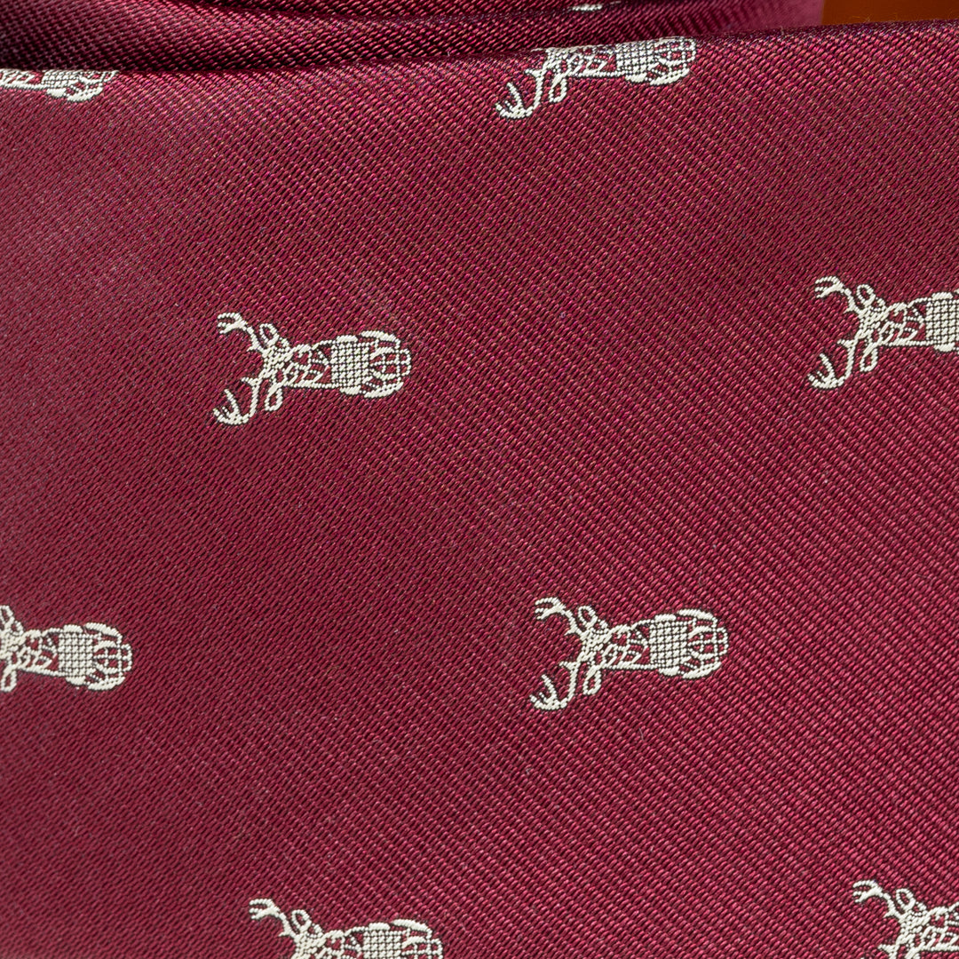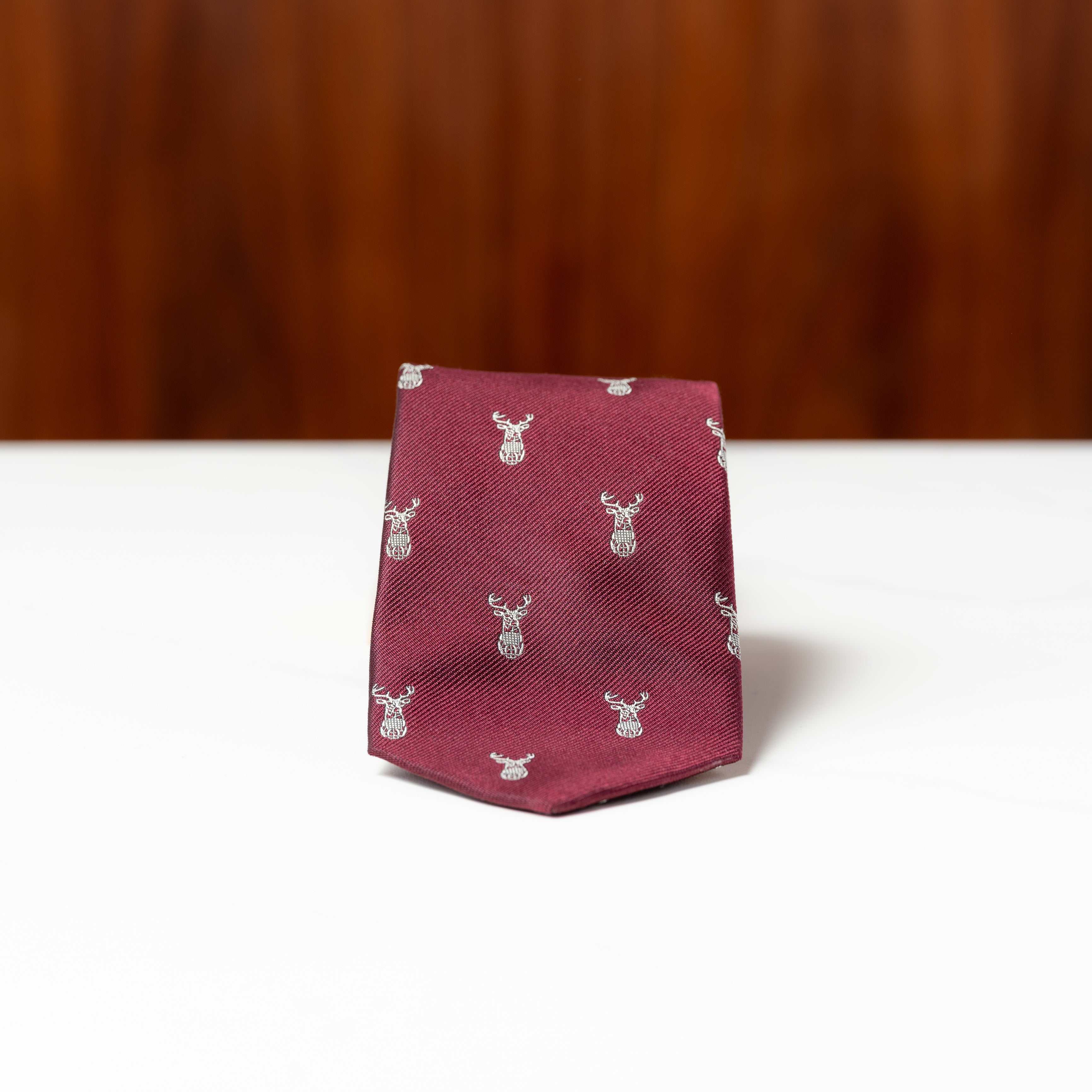 -Silk: Burgundy with Wildwood Stag; woven in England, in a small batch, exclusively for Wildwood & Company.
