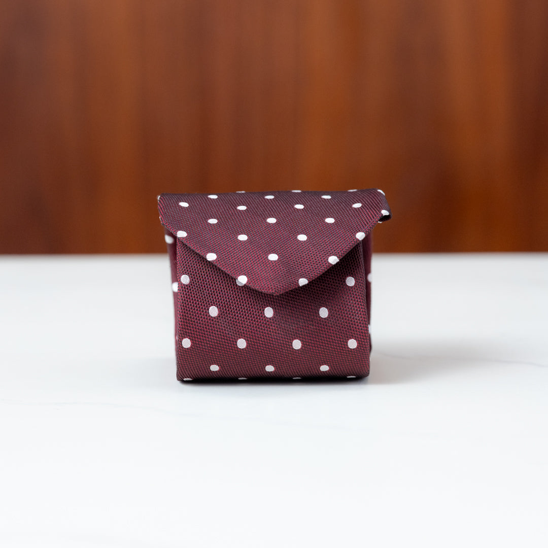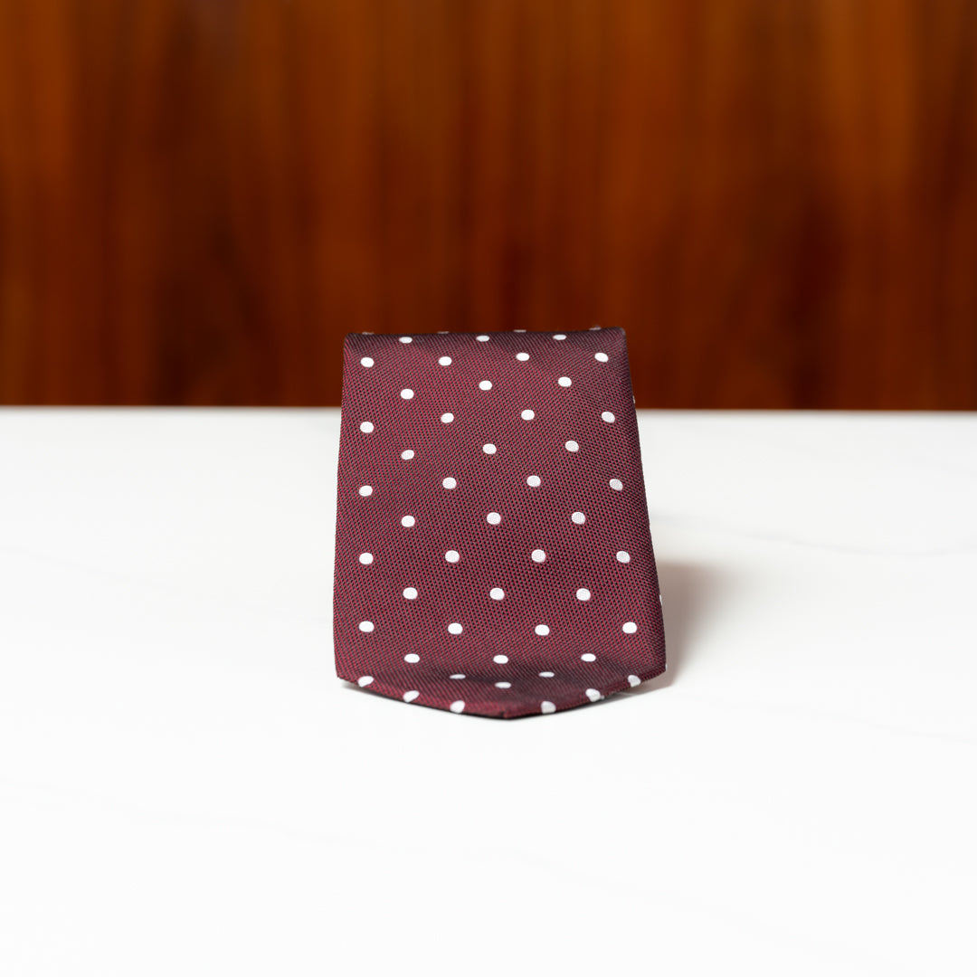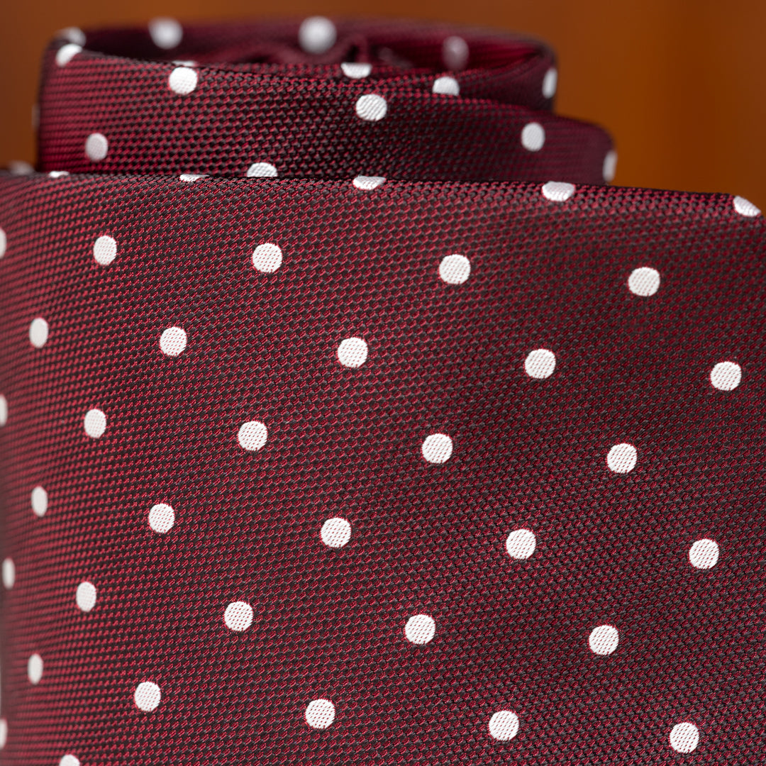 -Silk: Burgundy with white polka dots; woven in England, in a small batch, exclusively for Wildwood & Company.