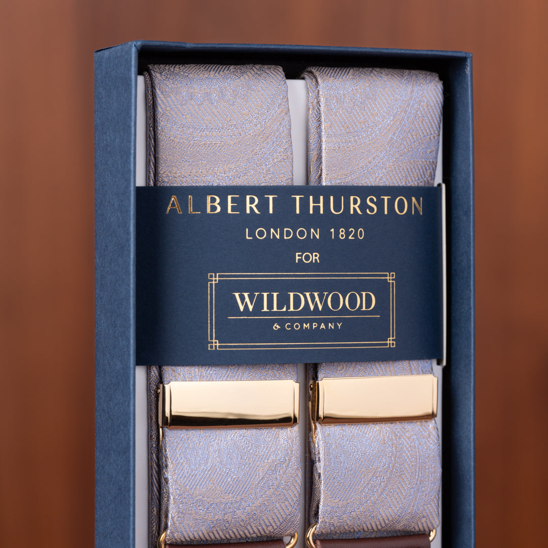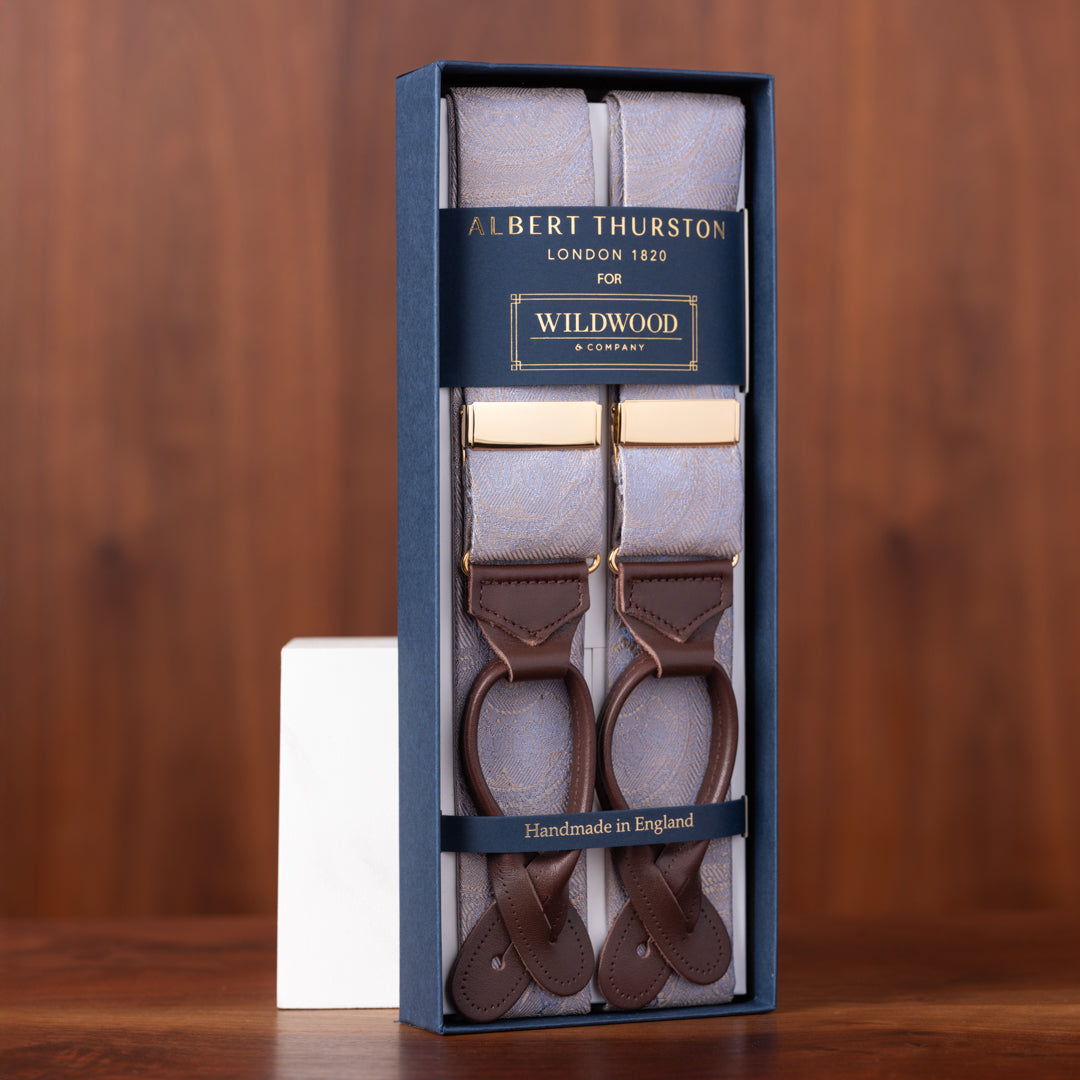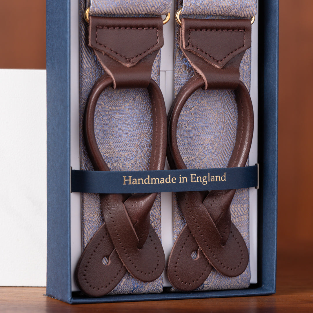 These suspenders (also known as braces in the UK) are handmade in our own unique silk, in collaboration with Albert Thurston, the world's top maker of suspenders since 1820 (who has also made braces for every James Bond film).