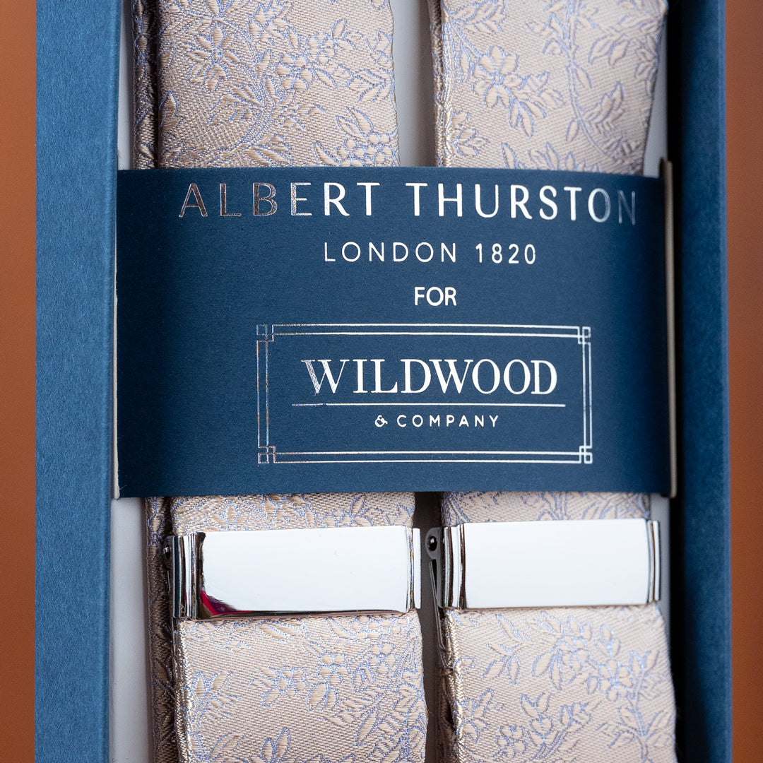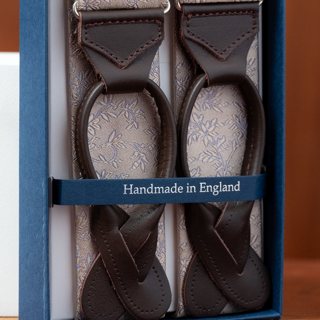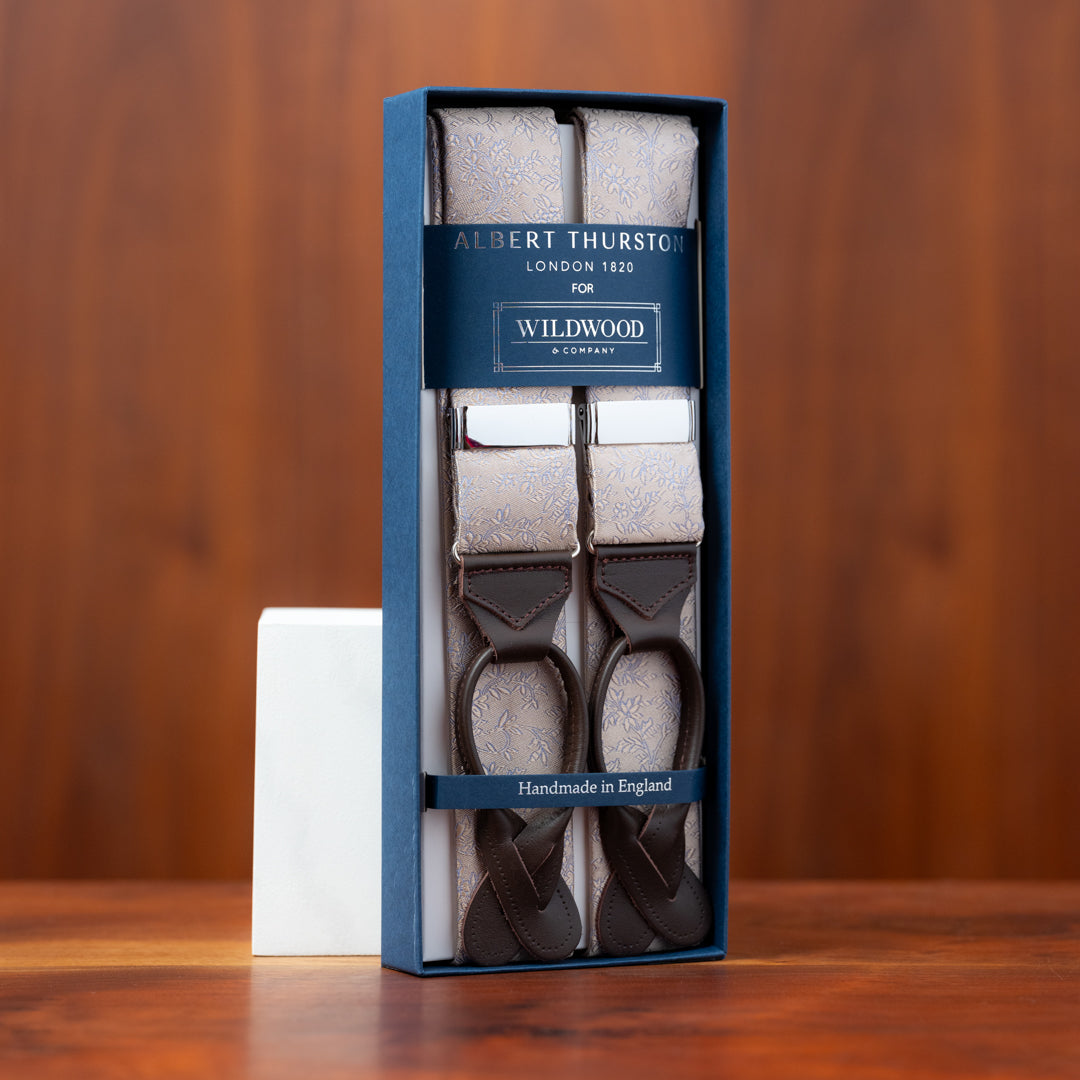 These suspenders (also known as braces in the UK) are handmade in our own unique silk, in collaboration with Albert Thurston, the world's top maker of suspenders since 1820 (who has also made braces for every James Bond film).
