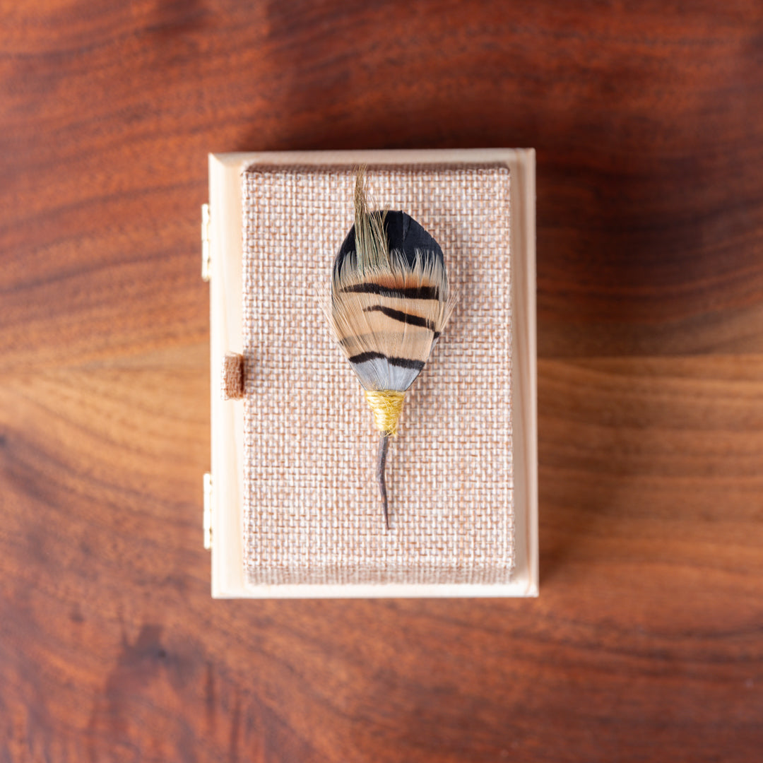 Feathers- Sustainably sourced layers of taupe, brown and blue-grey partridge feathers with navy and rust pheasant feathers.