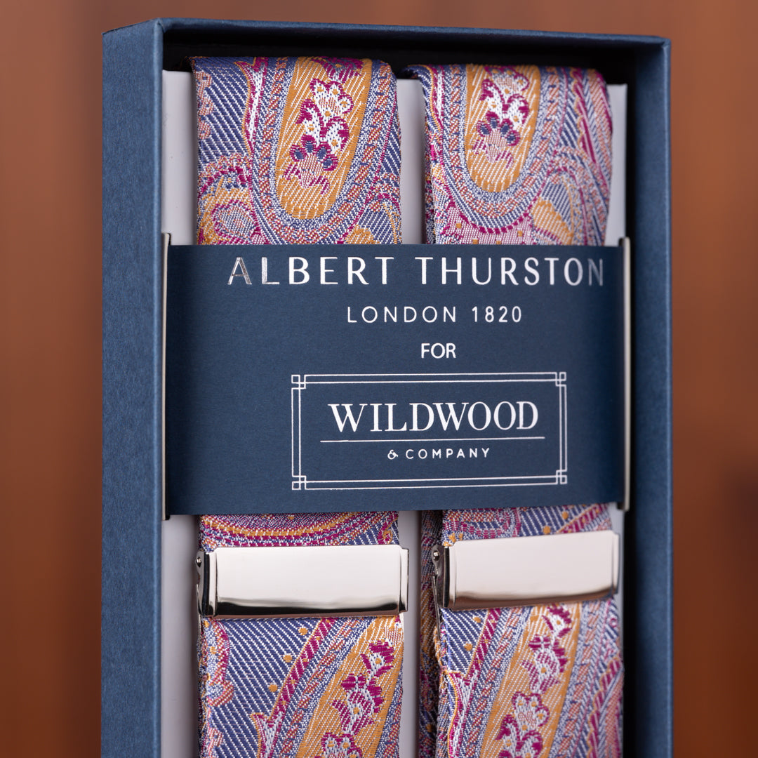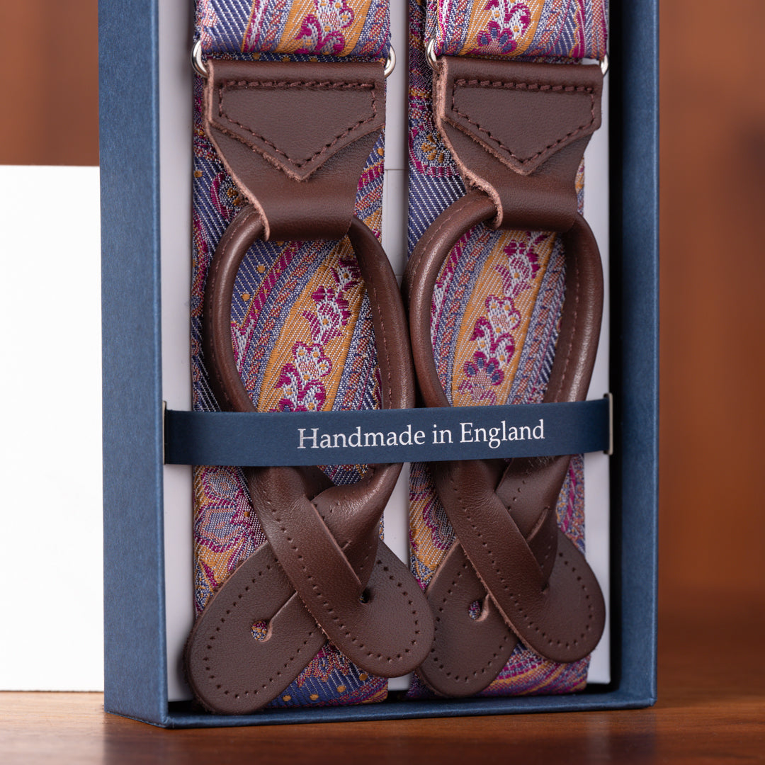 These suspenders (also known as braces in the UK) are handmade in our own unique silk, in collaboration with Albert Thurston, the world's top maker of suspenders since 1820 (who has also made braces for every James Bond film).