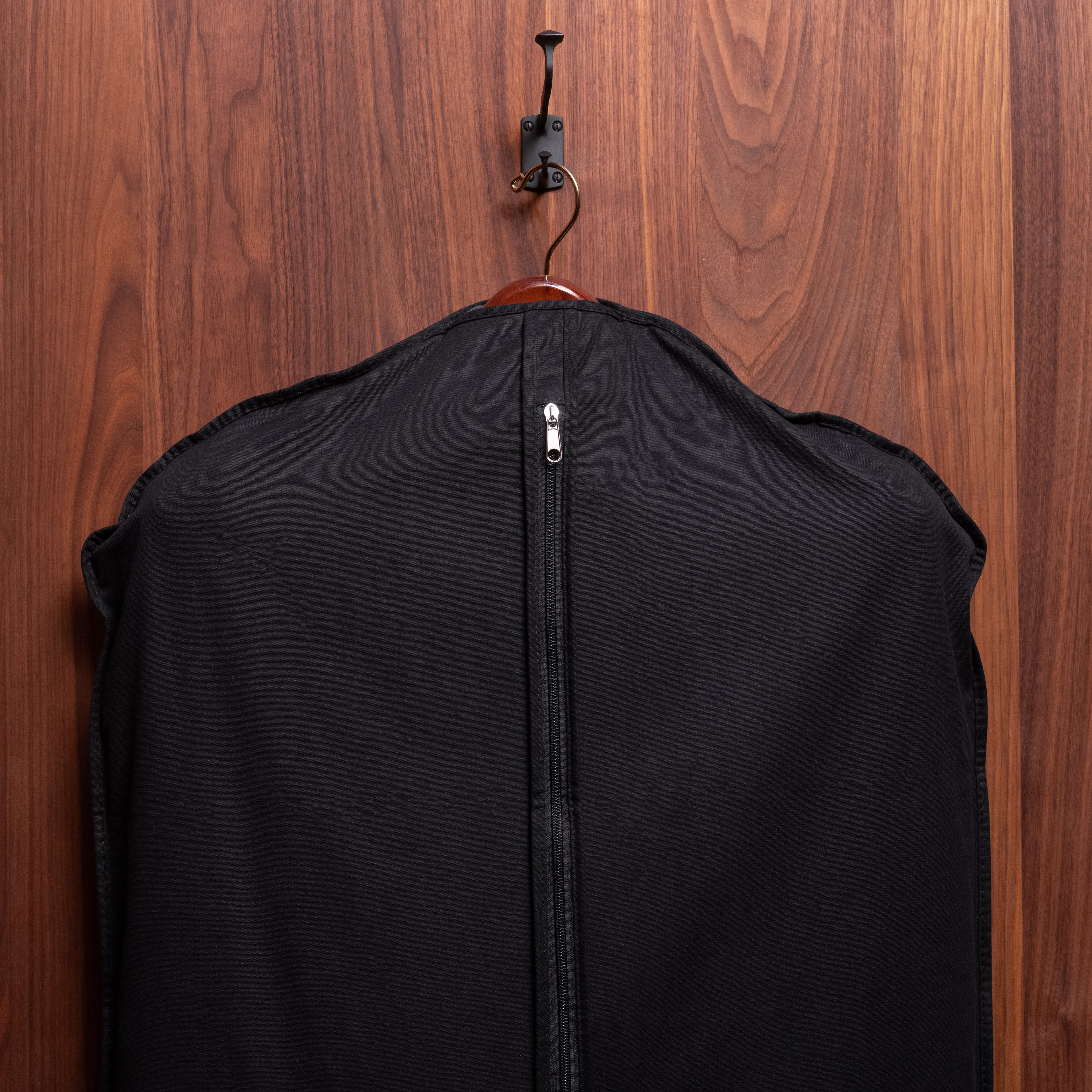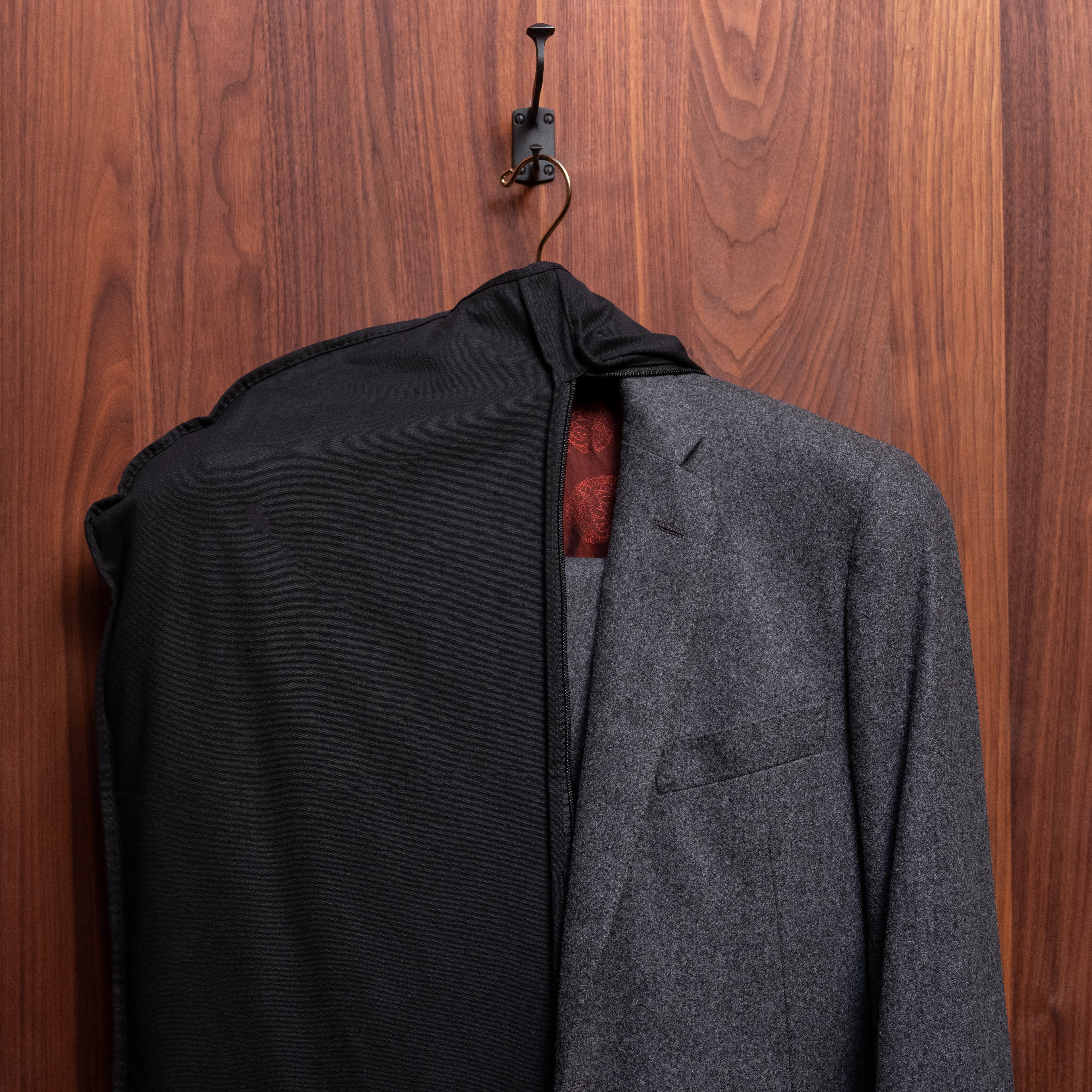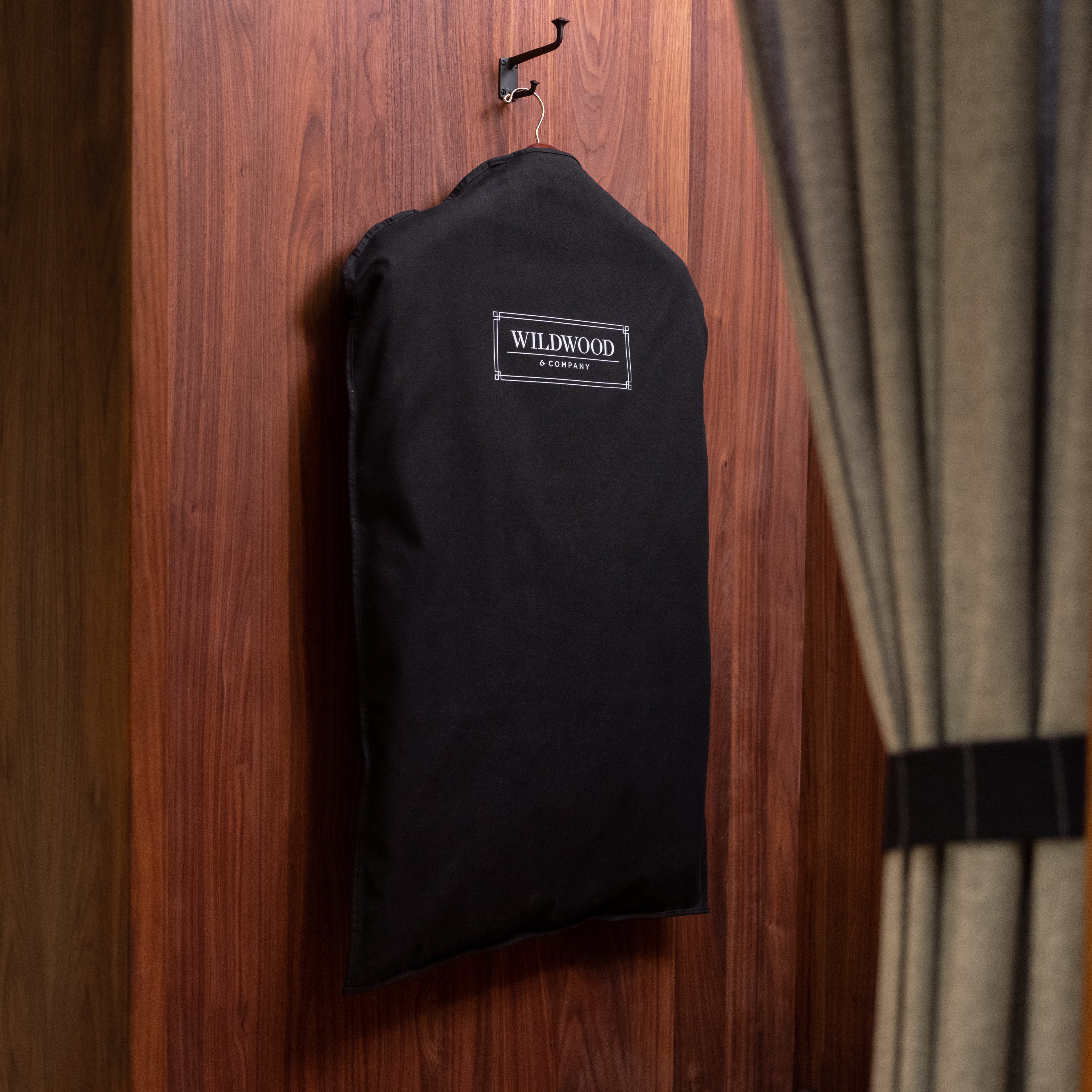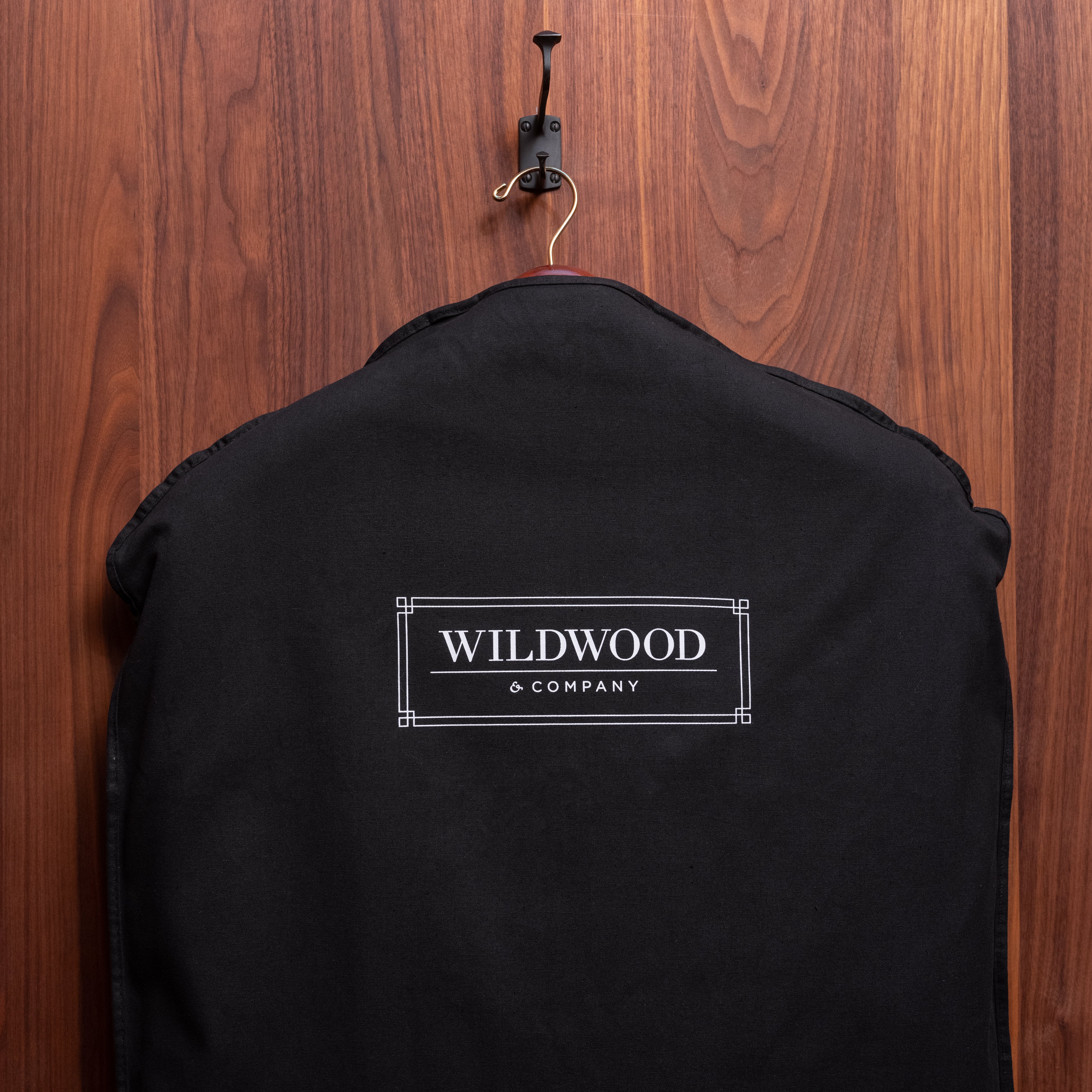 Our 100% cotton canvas garment bag with Wildwood logo is the same bag we give our clients with their finished bespoke suits; it's perfect for travel or storage.